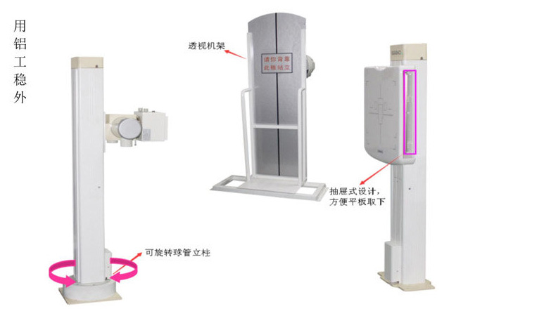 1、DR 支架采用電動的形式進行各種操作,支架固定安裝在汽車上,支架可進行上下升降,滿足不同的檢查需求,胸片架與球管支架550m范圍內上下自動跟蹤。