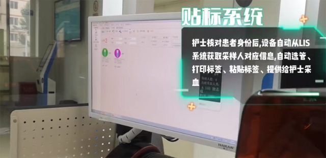 醫(yī)護(hù)人員核對患者的身份信息,設(shè)備自動獲取采樣人對應(yīng)信息,自動選管,打印標(biāo)簽、粘貼標(biāo)簽,提供給醫(yī)護(hù)人員采血。選管、貼標(biāo)、打條碼、出管,護(hù)士只需要做消毒扎針工作就可以了。選擇對應(yīng)顏色的采血管邊打印對應(yīng)標(biāo)簽,保留原有的刻度線進(jìn)行貼標(biāo)粘貼。自動復(fù)核提供給醫(yī)護(hù)人員使用。醫(yī)護(hù)人員取管確認(rèn)信息后進(jìn)行采血操作,將采完血的樣本放入傳輸系統(tǒng)里面。