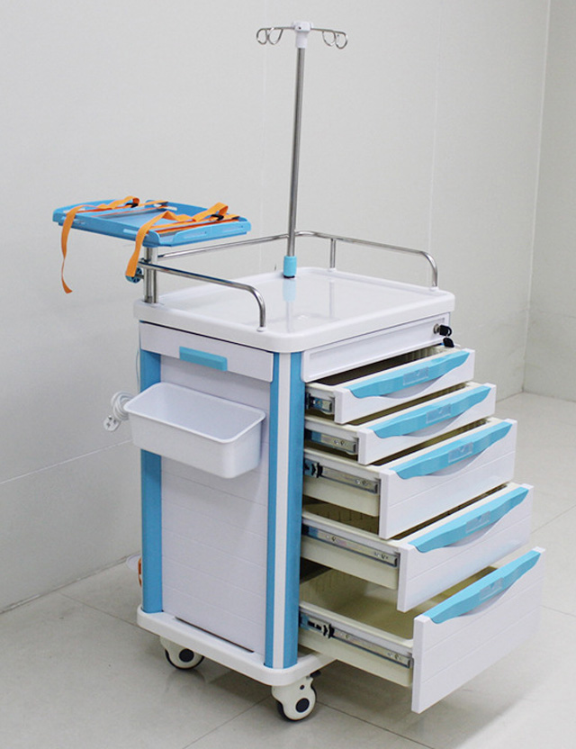 搶救車的基本構(gòu)造是車體、輪子、還有醫(yī)用櫥柜。櫥柜的柜體是放藥品的空格。車體有固定氧氣瓶的套筒。還配有輸液架,還有多個放物品的抽屜。蓋板可以蓋住藥物。采用了塑鋼材料,包含工作臺面,雜物箱,輸液架,輪子,垃圾桶。一般分四個層次,急救藥品區(qū),放置一定數(shù)量的急救藥品,根據(jù)藥品使用頻率來依次排列。輸液區(qū),放了輸液器、注冊器、留置針、止血貼、消毒棉、砂輪、等。呼吸物品區(qū),開口器、壓舌板、吸氧管、各種型號插管喉鏡。其他物品,溫度計、血壓計、電筒、負壓吸引器等。