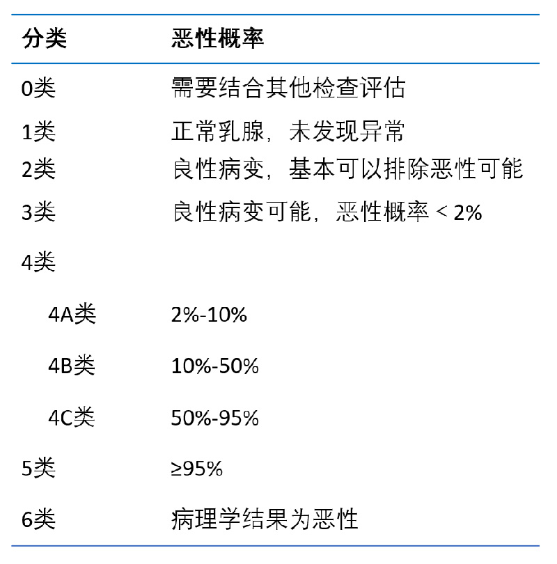 BI-RADS系統(tǒng)可分為0-6類。其中0類指醫(yī)生懷疑有惡性可能,但是沒有從超聲檢查中獲取充分的證據(jù),需要結(jié)合其他檢查結(jié)果評估。其余1-6類,類別越高,惡性概率越高。各類別惡性概率如下表所示。因此,如果看到自己的報告單上寫著“BI-RADS 1類”或“BI-RADS 2類”,可以稍稍放下心來,定期復(fù)查;如果報告單上寫著0類或3、4、5、6類,則需要及時前往醫(yī)院就診,請醫(yī)生給出專業(yè)意見。