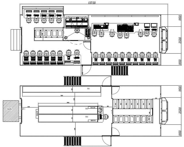 由于收車時內(nèi)套拉箱頂收回,強冷機柜若在拉箱區(qū),出回風(fēng)會很難設(shè)計,所以通常將強冷柜放在不帶拉箱的部位,加上兩側(cè)拉箱總寬度不得超2.5米,這導(dǎo)致整個廂體很難做大,以下是幾種最常見的布局,基本都是配備4組強冷機柜,如果想要增加強冷機柜數(shù)量,就需要減小拉箱面積,這就會影響到制作區(qū)和技術(shù)區(qū)面積。無論是單外套還是雙外套,由于拉箱頂在主頂外邊,強冷的出回風(fēng)就比較好設(shè)計,但同樣受到兩側(cè)拉箱總寬度不得超2.5米的限制,廂體也不可能做太大,可以考慮配合第三級內(nèi)套拉箱使用由于內(nèi)外套是采用上下疊加的形式,避開了左右相加不能超2.55米的限制,所以設(shè)計起來就比較靈活,也能做得更大,強冷區(qū)只要避開內(nèi)套拉箱,出回風(fēng)也比較好設(shè)計。以下是最近國內(nèi)比較常見的布局。