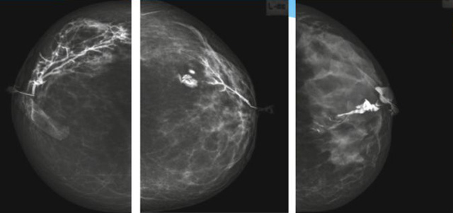 乳腺導管內乳頭狀瘤分為以下兩個,位于乳暈區(qū)大導管的中央型乳頭狀瘤,起源于末梢導管小葉單位的外周型乳頭狀瘤。外周型乳頭狀瘤常常沒有明顯的的臨床表現(xiàn),常因X線或乳腺超聲設備檢查發(fā)現(xiàn)。重點要關注的是中央型乳頭狀瘤,發(fā)生于任何年齡的女性,以40~50歲者居多。它表現(xiàn)為:單側乳頭溢液,特別是血性溢液少數(shù)病人可在乳暈區(qū)觸及腫塊。從病理學上面講表現(xiàn)為導管上皮和間質增生形成有纖維脈管束的乳頭狀結構。這是它一個病理學上的表現(xiàn)。它的超聲表現(xiàn)為:病變導管囊狀擴張呈無回聲,內可見乳頭狀低回聲或中等回聲。乳暈處的導管擴張,管腔內可見邊界清楚的,低回聲實性結節(jié)。外周型導管內乳頭狀瘤可,表現(xiàn)擴張為為低回聲的實性結節(jié),CDFI:部分腫瘤可顯示為軸心性的看到血流信號。乳腺增生癥:可見導管擴張,內無乳頭狀實性回聲,導管內乳頭狀癌:囊內乳頭狀癌病變較大,不規(guī)則,厚基底,血流豐富。以囊性為主的混合回聲,形態(tài)不規(guī)則,內見實性低回聲實性低回聲可見少量血流,病理為囊內乳頭狀癌。