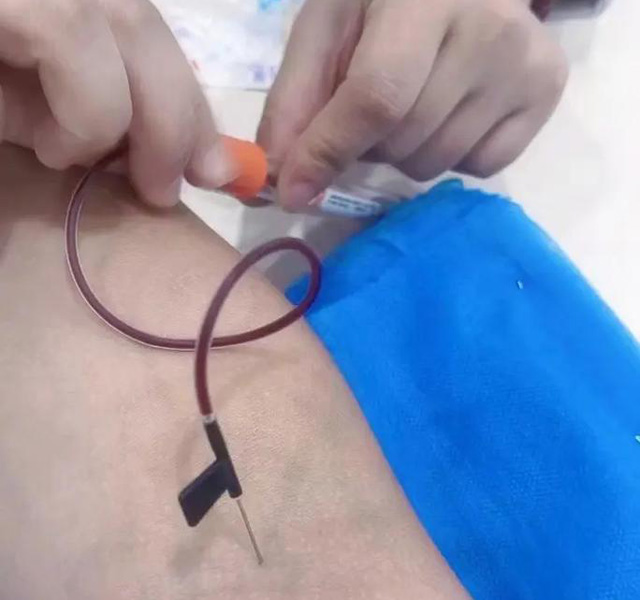 血管帶一定要扎緊,血管才會充盈。然后握拳可以看到血管。血管扁的不明顯的話就輕輕的拍一下。不需要用力的打這樣可以清晰的看到血管。血管比較細的話。扎血管的地方消毒兩次,采血針打開后。看到的兩頭都是針,針的一頭插進血管,另外一頭插到管引血液。血液抽的差不多時候就用大拇指頂著管頭。血就流不出來了。然后解開止血帶,取一根干棉簽。然后把管的針拔出來就可以了。進針角度大時候不疼但容易漏針,進針角度小時候有點疼不容易漏針。進針的角度為15度-30度不容易漏針也不疼。