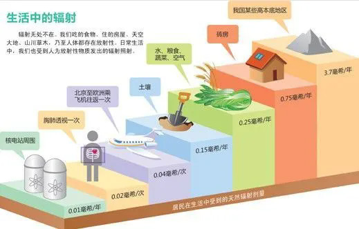 核電站醫(yī)院的放射科有電離輻射,我們生活中也有輻射。全世界的人的本底輻射劑量是2.4mSv/人,本底輻射:宇宙射線、天然放射性核素發(fā)出的射線、宇宙射線的強度隨海拔高度的增加而增大,高原地區(qū)的人群受到的宇宙射線照射劑量比平原地區(qū)的人群高,宇宙射線的強度在對流層上大約10公里處最強。需要我們指出的是:適當?shù)奶烊挥行д丈鋵θ梭w是有益的。
