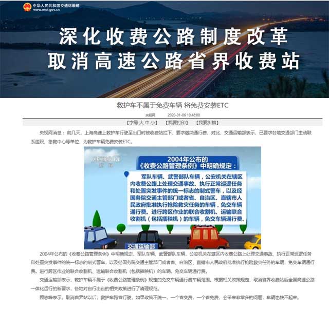 報(bào)道稱: 央視網(wǎng)消息 :前幾天,上海高速上救護(hù)車行駛至出口時(shí)被收費(fèi)站攔下,要求繳納通行費(fèi),對(duì)此,交通運(yùn)輸部表示,已要求各地交通部門(mén)主動(dòng)聯(lián)系醫(yī)院、急救中心等單位,為救護(hù)車輛免費(fèi)安裝ETC。 2004年公布的《收費(fèi)公路管理?xiàng)l例》中明確規(guī)定,軍隊(duì)車輛、武警部隊(duì)車輛,公安機(jī)關(guān)在轄區(qū)內(nèi)收費(fèi)公路上處理交通事故、執(zhí)行正常巡邏任務(wù)和處置突發(fā)事件的統(tǒng)一標(biāo)志的制式警車,以及經(jīng)國(guó)務(wù)院交通主管部門(mén)或者省、自治區(qū)、直轄市人民政府批準(zhǔn)執(zhí)行搶險(xiǎn)救災(zāi)任務(wù)的車輛,免交車輛通行費(fèi)。進(jìn)行跨區(qū)作業(yè)的聯(lián)合收割機(jī)、運(yùn)輸聯(lián)合收割機(jī)(包括插秧機(jī))的車輛,免交車輛通行費(fèi)。 交通運(yùn)輸部表示,救護(hù)車輛不屬于《收費(fèi)公路管理?xiàng)l例》規(guī)定的免交車輛通行費(fèi)車輛范圍。根據(jù)相關(guān)政策規(guī)定,取消省界收費(fèi)站后全國(guó)高速公路一體化運(yùn)行的新要求,各地對(duì)自行出臺(tái)的相關(guān)政策進(jìn)行了清理規(guī)范。 顧志峰表示,取消省界站以后,救護(hù)車跨省行駛,如果政策不統(tǒng)一,一個(gè)省交費(fèi),一個(gè)省免費(fèi),會(huì)帶來(lái)非常多的問(wèn)題,車輛也快不起來(lái)。